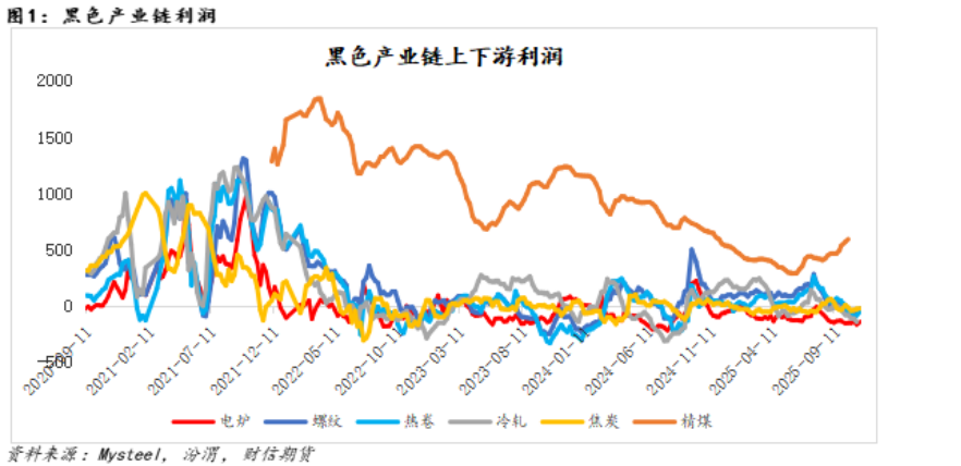 当前黑色产业链利润格局呈现显著分化:上游原料煤利润延续回升态势,而中下游的焦化与钢厂利润持续受到挤压,形成下游环节向上游争夺利润的格局。