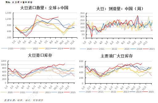 预期:虽美政府官员公开发布消息称中国将在接下来的时间大量进口美豆(截止至25年年底,进口美豆1200万吨,未来三年每年进口美豆2500万吨),但从国内油厂角度来看,目前美豆进口关税水平维持在13%的水平,美豆性价比较低,且美国官方公布的信息尚无中国政府的明确回复确认,但中国买美豆的小道消息频发,再度点燃美豆出口预期的热情。当下26年一季度买船进度整体偏慢,美豆采购量目前依然寥寥,大豆主要来源国仍是巴西,从钢联数据来看,11月份到港量预计968.5万吨,12月700万吨,1月份500万吨(后续或有调整),进口量逐步下行,结合各方数据从采购进度来看,当下采购量级占预计量级的50%左右,进度偏慢。因此预计远月或维持一定程度的油厂榨利水平,但具体如何演绎仍需关注中美关于大豆的进口谈判情况和中国购买美豆的实际落地情况。