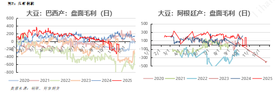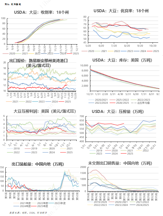 受制于美国政府停摆,美国大豆生产、生长指标暂停更新。从美国国内来看,大豆价格坚挺走高,其国内油厂压榨利润环比下降,同比亦偏弱,但因生柴政策需求强劲,压榨量级整体仍然出现较为明显的增幅;此外,虽中国调低了对美国大豆的进口关税水平,但13%的进口关税仍然使中国油企难以进口美豆,导致美国大豆出口需求仍然偏弱,关注后续中美贸易关系发展动态。