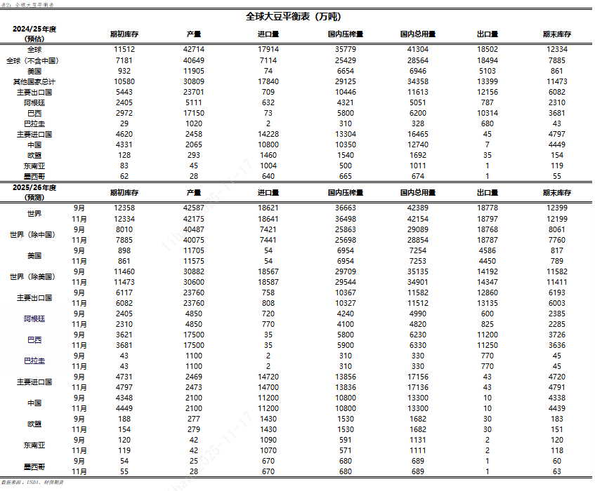 从全球平衡表上来看,全球期末库存下调200万吨、产量下调412万吨、压榨量下调165万吨、期初库存下调24万吨;巴西期初库存上调60万吨、压榨上调100万吨,出口上调50万吨、期末库存下调90万吨;阿根廷期初库存下调95万吨、进口量上调50万吨、国内压榨量下调140万吨、出口量上调225万吨、期末库存下调100万吨;巴拉圭无变化。