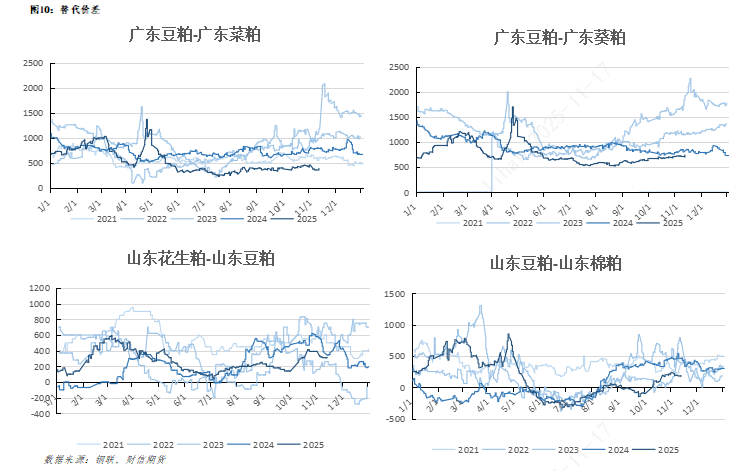 从广东地区来看,豆粕-菜粕价差在350-450元/吨,豆粕性价比突出,豆葵价差逐步走高,目前在700-800元/吨左右,豆粕性价比逐步降低,但仍可部分替代葵花粕使用,从山东地区的花生粕、棉粕角度来看,豆粕性价比亦相对突出。