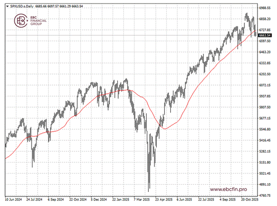 标普500指数跌破50日均线后,正向6640点附近低位下探,该位置或能遏制进一步跌势。若该支撑位失守,很可能开启新一轮下跌行情。