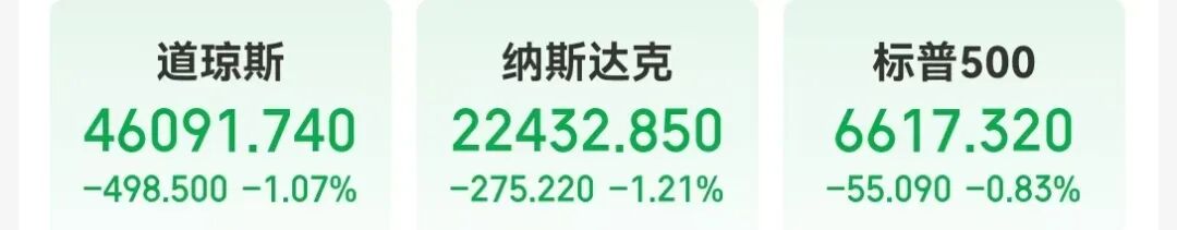 美股三大指数集体收跌,道琼斯指数跌1.07%,标普500指数跌0.83%,纳斯达克综合指数跌1.21%。