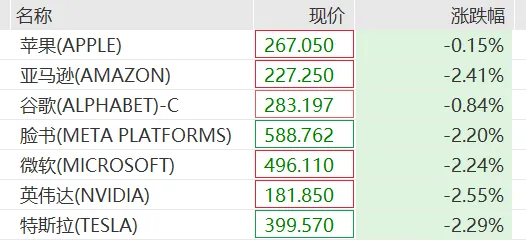 美股科技七巨头指数跌近2%,英伟达、特斯拉、亚马逊、微软、脸书均跌超2%。