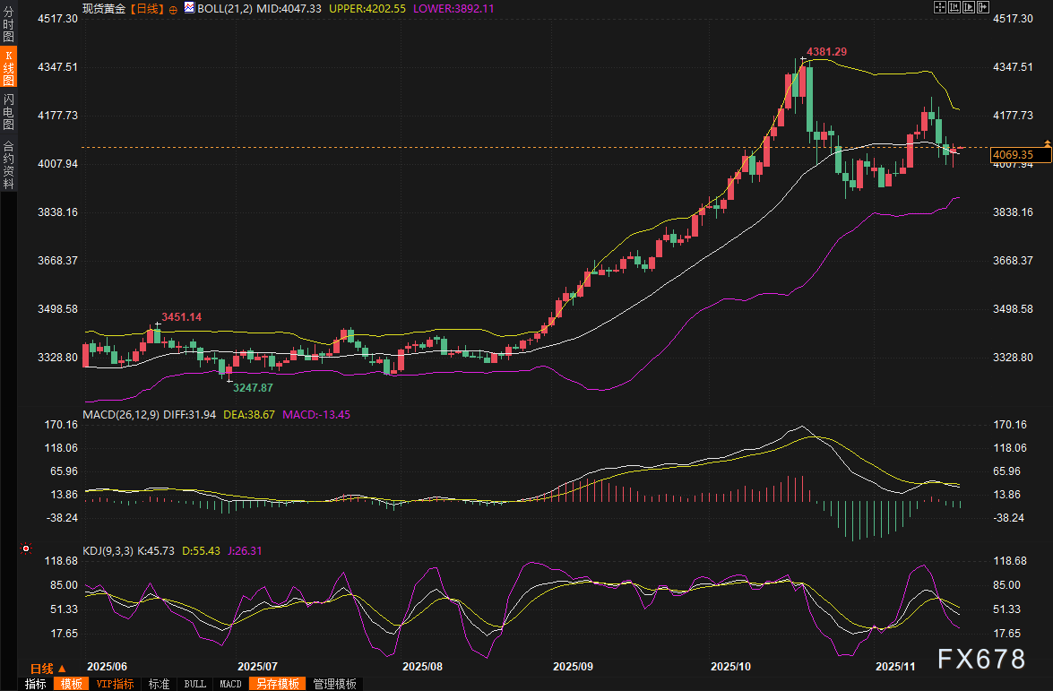 汇通财经APP讯——周二(11月18日)出炉的美国最新就业数据全面崩盘,直接把美联储12月降息预期从谷底拉回50%附近,现货黄金从盘盘中触及的一周低点3998美元暴力反弹,盘中最高摸到4080美元,最终收涨0.54%报4067.44美元,一夜终结三连阴,上演“王者归来”戏码!周三(11月19日)亚市早盘,现货黄金窄幅震荡,目前交投于4070美元/盎司附近,本交易日市场目光将转向美联储会议纪要,此外,还需要继续关注美联储官员的讲话。