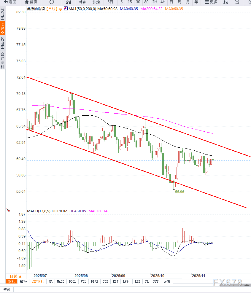 RSI指标徘徊在50下方,反映市场情绪偏谨慎;K线形态连续收出上影线,显示上方卖压随油价反弹而增强。若油价跌破60美元关键支撑,短线可能进一步下探至58.5—59美元区域;反之,若能突破61.5美元压力,则有机会打开上行空间至63美元附近。
