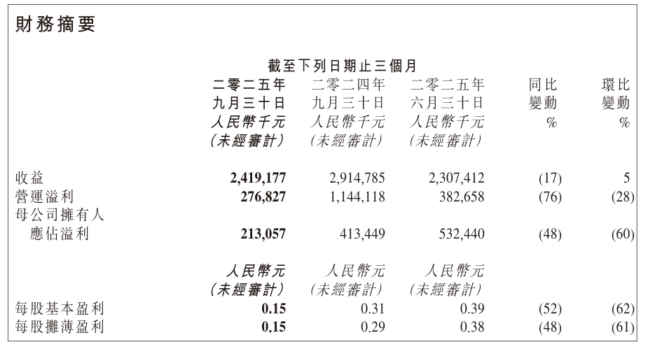 2025 年第三季度的母公司所有者应占利润为人民币 2.131 亿元,而 2024 年第三季度及 2025 年第二季度的利润分别为人民币 4.134 亿元及人民币 5.324 亿元,同比下降 48%,环比下降 60%。