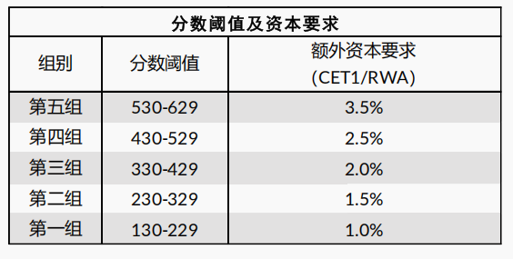 入选G-SIB的商业银行,将根据其组别的不同,满足更高的资本要求,且需要在确定时间内额外满足总损失吸收能力(TLAC)的要求。巴塞尔委员会公布了对银行评分的方法论和不同组别的评分阈值,惠誉博华据此对G-SIB名单和分组进行定期预测。从第一组到第五组,额外资本要求依次提高,分别为1%、1.5%、2%、2.5%、3.5%。