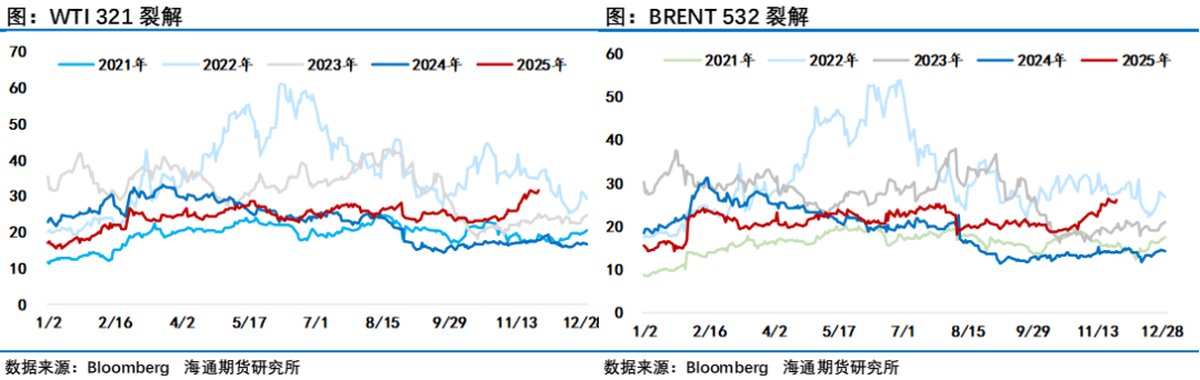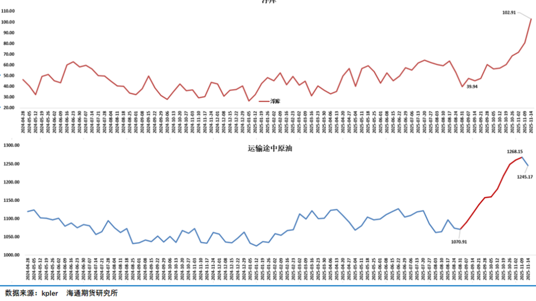 不过IEA也注意到了市场的而不确定性,在月报中提到对俄罗斯原油产量前景的展望存在“可观的下行风险”,但暂不估计具体影响,直到看到更多关于执行的细节。根据相关报道随着美国对俄罗斯石油公司和卢克石油的制裁颠覆原油贸易流向,其影响正在显现,俄罗斯旗舰原油乌拉尔相对布伦特原油的贴水近日已扩大至今年最阔水平,达到每桶20美元,较11月初13-14美元/桶的贴水幅度有所扩大。贸易商报告指出,尽管总体俄罗斯出口流量迄今保持稳定,但油轮在海上滞留的时间显著延长。Signal Ocean的最新分析显示,受制裁船只的浮动存储量已达到自2022年中期以来的最高水平,这一现象被归因于卸货延迟、船舶在航行途中受到制裁被拒之门外,以及买家悄然收紧采购政策以管理合规风险。一方面俄罗斯原油受制裁约束,另一方面乌克兰继续加大对俄能源设施打击阻止其石油出口,以实现大幅削减克里姆林宫的出口收入,迫使普京总统回到结束乌克兰战争的谈判桌前降的目的。