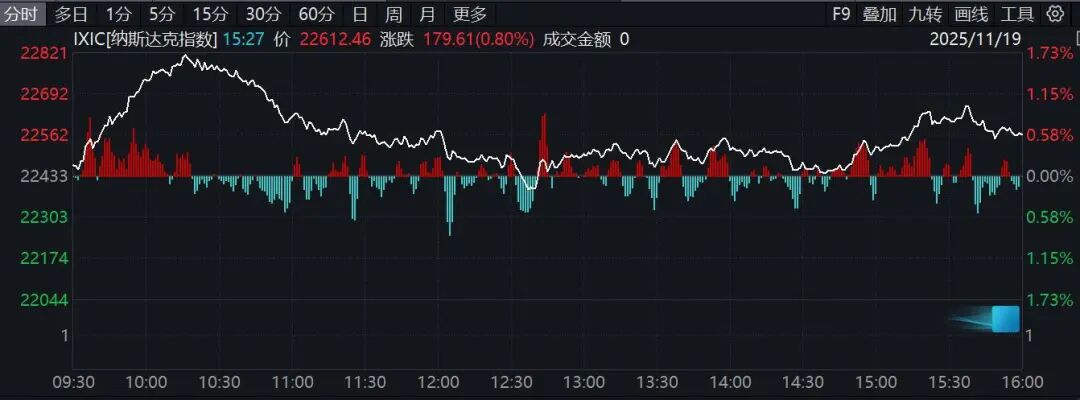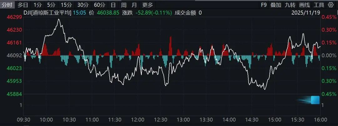 11月19日,美股三大指数集体收涨,道琼斯指数涨0.10%,标普500指数涨0.38%,纳斯达克综合指数涨0.59%。