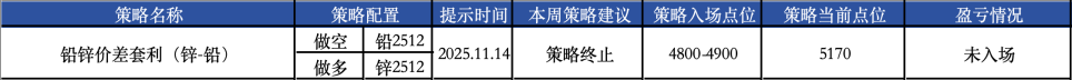 价差判断:上周预计12月铅锌价差(指锌-铅)走扩,本周价差如期走扩,但价差并未达到入场点位。近期,中央环保督察组入驻多地,或对再生铅生产形成扰动。策略终止,等待再次入场机会。