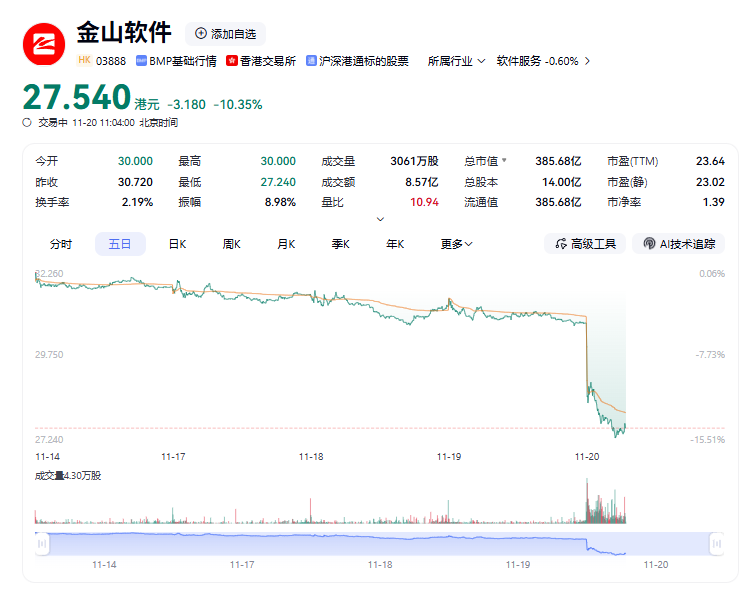 11月20日,香港恒生科技指数跌幅扩大至1%,其中金山软件(03888.HK)一度跌超11%。截至早盘收盘,下跌9.51%,报27.80港元。