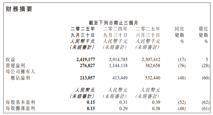 昨日,金山软件发布2025年第三季度业绩公告称,营收为人民币24.2亿元,环比增长5%,同比下降17%;归母净利润为2.13亿元,环比下降60%,同比下降48%;每股基本盈利为0.15元,环比下降62%,同比下降52%。经营活动产生的现金流量净额为4.94亿元,同比下降64%。