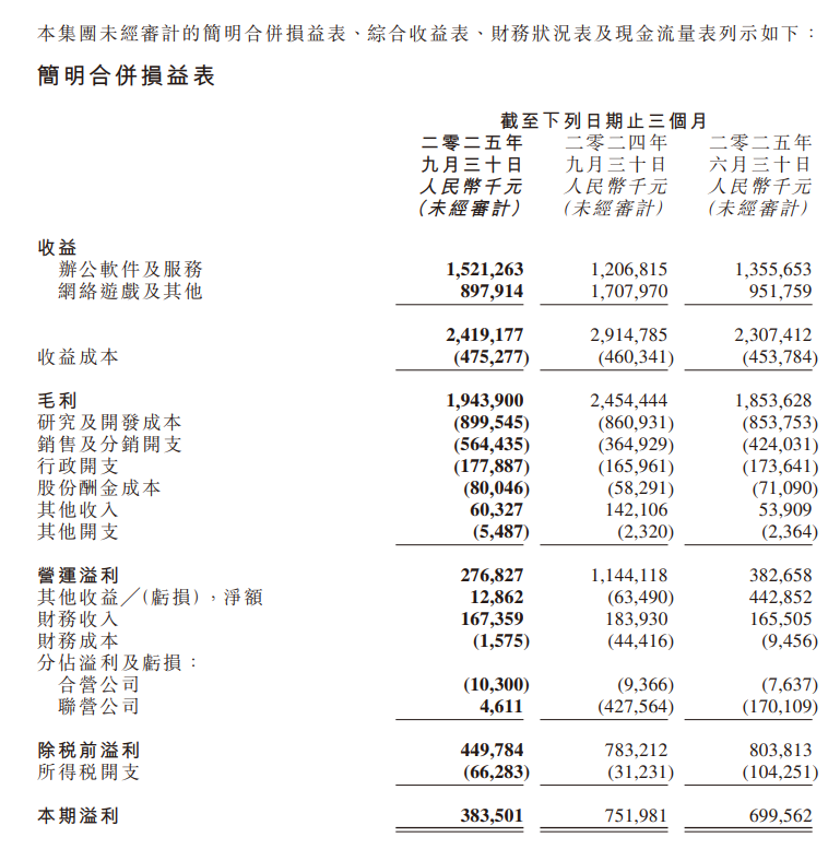 其中办公软件业务收入达人民币15.2亿元,同比增长26%,环比增长12%。这主要得益于金山办公集团的WPS软件、WPS365及WPS个人业务的增长。截至2025年9月底,全球WPS Office月活跃设备达6.69亿,同比增长9%。过去12个月,金山办公累计付费个人用户达4179万,较去年同期提升10%。