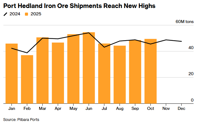 由于中国对铁矿石的需求展现出韧性,澳大利亚主要出口港的铁矿石发运量升至10月历史最高水平。根据皮尔巴拉港口管理局数据,西澳大利亚黑德兰港上月铁矿石出口量达到4950万吨,较2024年10月增长近8%,创下自2010年有记录以来同期最高发运量。