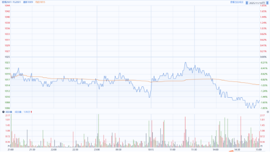 当日(20251119),期货品种玻璃FG2601合约全天维持震荡下行走势,较昨日下跌明显,收阴线。较昨日下跌约1.56%,收于1009点。全日成交量为1294110手,持仓量为1990501手,持仓量较昨日增加2524手。