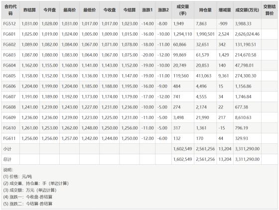 玻璃期货12个合约价格呈现近低远高的态势,全天各合约均有一定幅度下跌。品种持仓量2561256手,较上一交易日增加13204手,其中活跃合约玻璃FG2601持仓量增加2524手。
