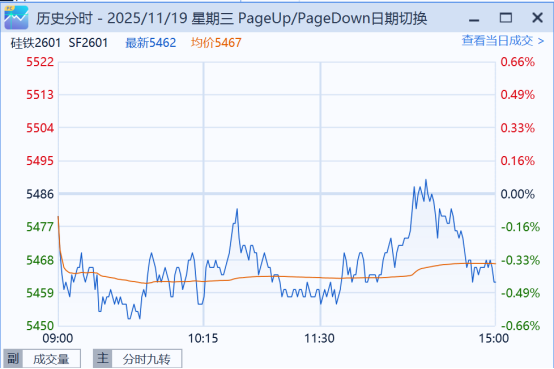 11月19日,硅铁期货主力合约SF2601收盘报5,462元/吨,市场延续震荡偏弱格局。当前供需双弱、成本支撑与需求疲软交织,缺乏明确方向驱动,短期或延续震荡筑底态势,中长期需关注钢厂采购节奏与成本端电价变动。