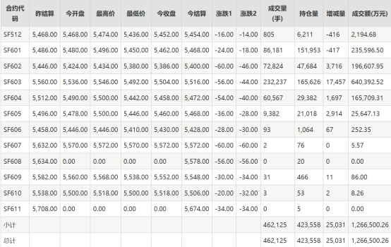 期货12个合约,全天各合约涨跌不一。品种持仓量423558手,较上一交易日增加25031手,其中活跃合约硅铁SF2601,持仓量减少417手。