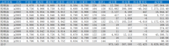 棕榈油期货12 个合约皆上涨,总成交97.31万手,品种持仓总量58.76万手,较昨日减仓5.24万手。
