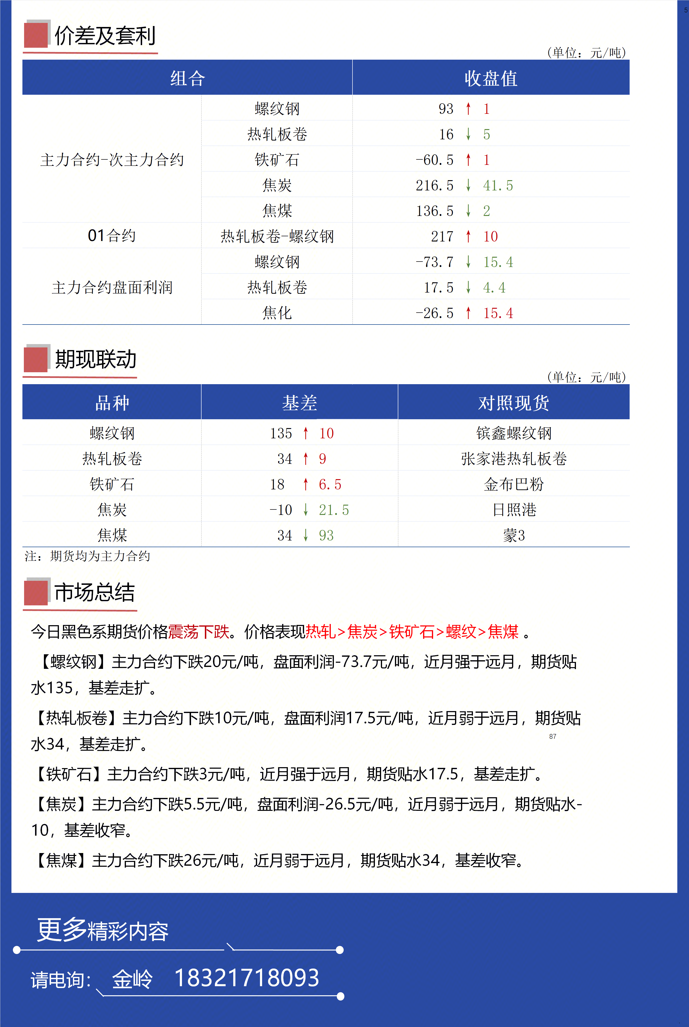 今日黑色系期货价格震荡下跌。价格表现热轧>焦炭>铁矿石>螺纹>焦煤 。 【螺纹钢】主力合约下跌20元/吨,盘面利润-73.7元/吨,近月强于远月,期货贴水135,基差走扩。【热轧板卷】主力合约下跌10元/吨,盘面利润17.5元/吨,近月弱于远月,期货贴水34,基差走扩。【铁矿石】主力合约下跌3元/吨,近月强于远月,期货贴水17.5,基差走扩。【焦炭】主力合约下跌5.5元/吨,盘面利润-26.5元/吨,近月弱于远月,期货贴水-10,基差收窄。【焦煤】主力合约下跌26元/吨,近月弱于远月,期货贴水34,基差收窄。