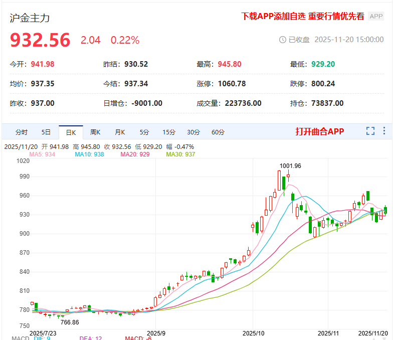 日内收盘,沪金上涨0.22%,报收932.56元/克。