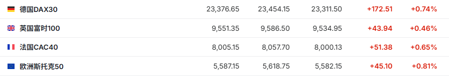 2. 截至发稿,德国DAX指数涨0.74%,英国富时100指数涨0.46%,法国CAC40指数涨0.65%,欧洲斯托克50指数涨0.81%。
