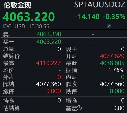 期货市场同样表现低迷。COMEX黄金期货日内出现跳水行情,截至记者发稿,COMEX黄金期货日内跌0.5%,报4062.2美元/盎司,盘中最低触及4034美元/盎司。