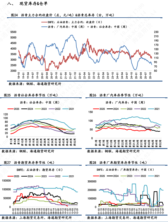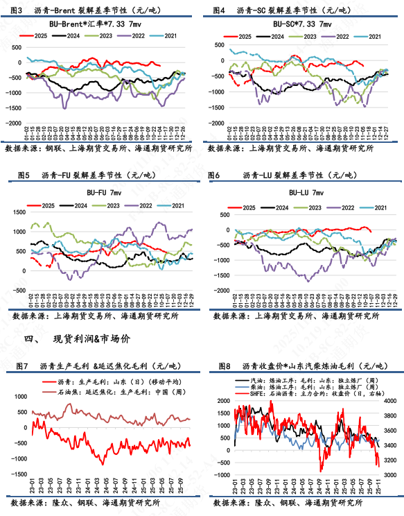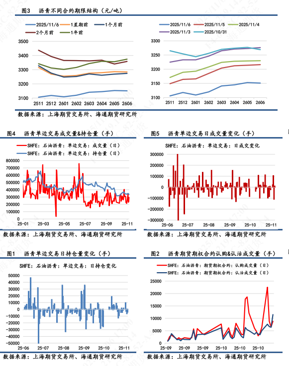 【1】盘面表现:BU主力2601高开后回落,开盘即最高价,全天低位震荡,最终收于3109元/吨,跌幅1.80%,自10月27日高点以来持续回落,7天累计跌幅5.3%,创下年内新低。次月合约2602跌幅 2.04%,合约期限结构呈现近低远高的Contango结构,与1星期前的back结构相反。