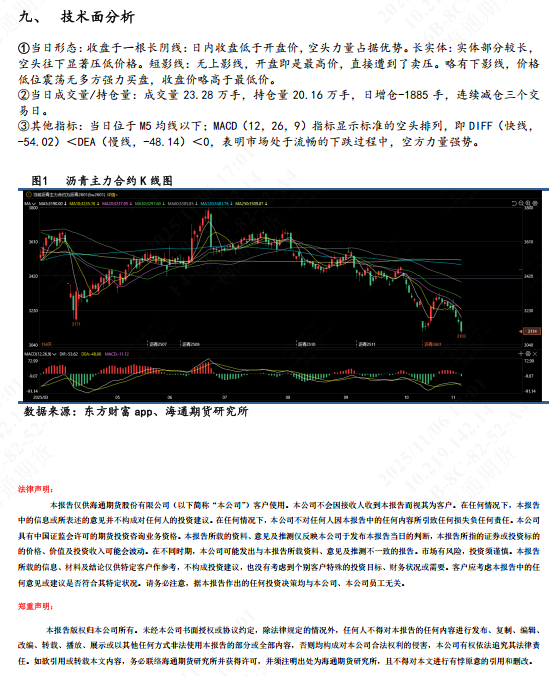 【6】短期展望:短期仍跟随油价摆动,价格弱势看待,自身上行空间仍受制于需求减弱和库存压力两方面影响。关注3000元/吨下跌整数关口。MACD指标可关注快慢线何时穿越0轴上方。年底前OPEC+增产冲击油价重心,沥青大概率跟跌重心下移。