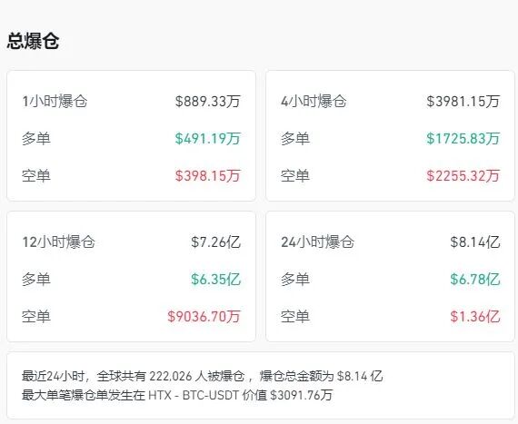Coinglass数据显示,加密货币全网24小时超22万人爆仓,8.14亿美元(约合人民币58亿元)灰飞烟灭。