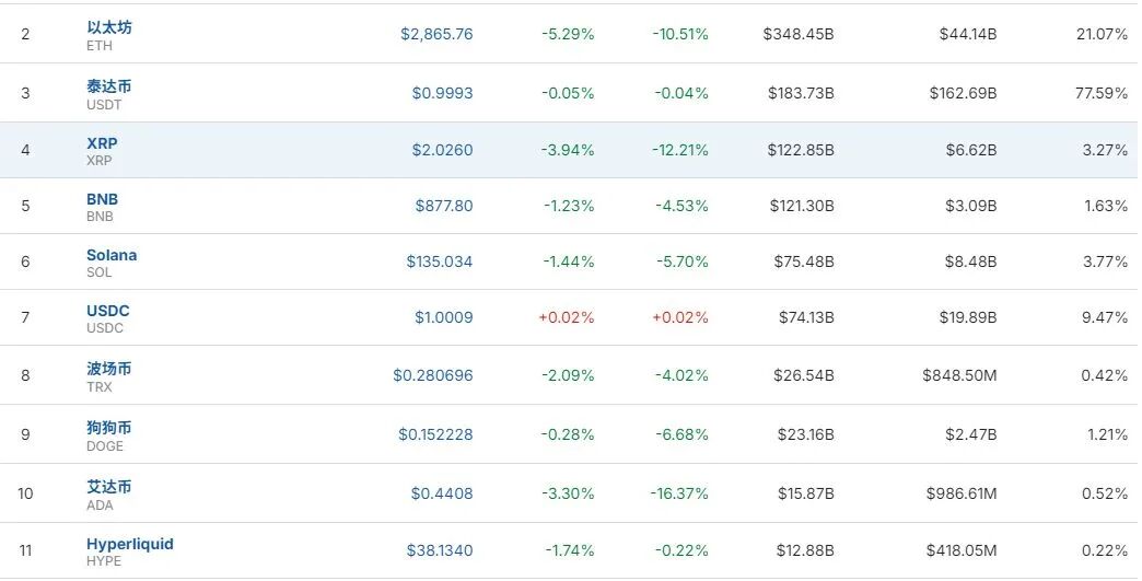 以太坊跌超5%,艾达币跌超3%。