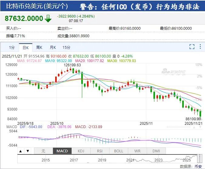截至11月21日发稿,比特币报87632美元,跌幅4.28%。