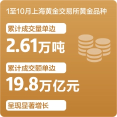 黄金市场显著增长。根据中国黄金协会及官方最新数据,今年1至10月黄金市场交易活跃。上海黄金交易所全部黄金品种累计成交量单边2.61万吨,累计成交额单边19.8万亿元,呈现显著增长。
