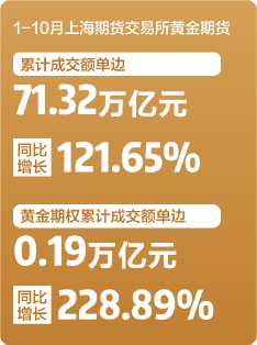 黄金衍生品市场交易额增长更为迅猛。根据中国期货业协会官网最新数据,1-10月,上海期货交易所黄金期货累计成交额单边71.32万亿元,同比增长121.65%,黄金期权累计成交额单边0.19万亿元,同比增长228.89%。