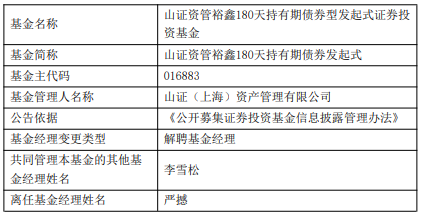 中国经济网北京11月21日讯近日,山证(上海)资产管理有限公司公告,严撼离任山证资管裕享增强债券发起式、山证资管裕鑫180天持有期债券发起式。