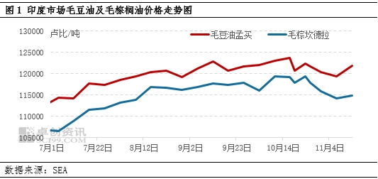 其中10月以来,印度豆油市场价格走高,主要受到进口量回落及国内需求强劲带动。因印度市场为了节日备货前几个月大量进口而导致10月减少了食用油进口量,豆油及棕榈油进口量均有所回落。