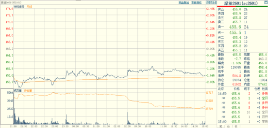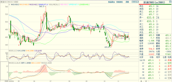 今日(20251120)原油期货价格震荡走低,主力合约SC2601收盘报455.5元/桶,较上一交易日下跌1.66%。市场交投活跃,全日成交11.9万手,持仓量3.9万手,较上日减少约1900手。