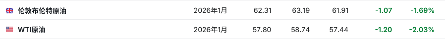 3. 截至发稿,WTI原油跌2.03%,报57.80美元/桶。布伦特原油跌1.69%,报62.31美元/桶。