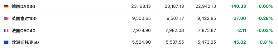 2. 截至发稿,德国DAX指数跌0.60%,英国富时100指数跌0.28%,法国CAC40指数跌0.03%,欧洲斯托克50指数跌0.81%。