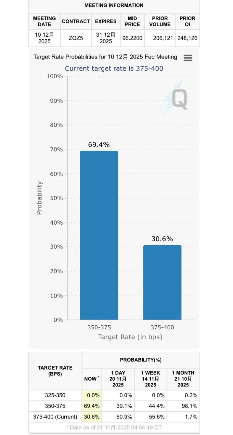 CME“美联储观察”最新显示,美联储12月降息25个基点的概率为69.4%,前一天仅为39.1%;维持利率不变的概率为30.6%,前一天高达60.9%。