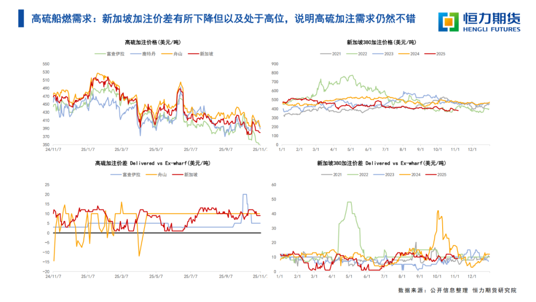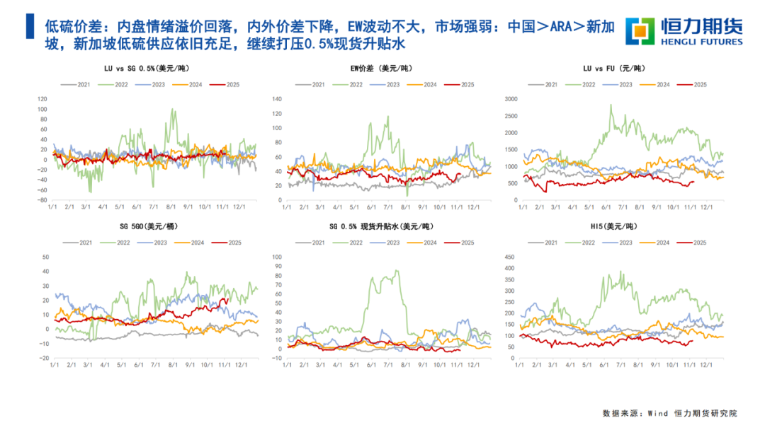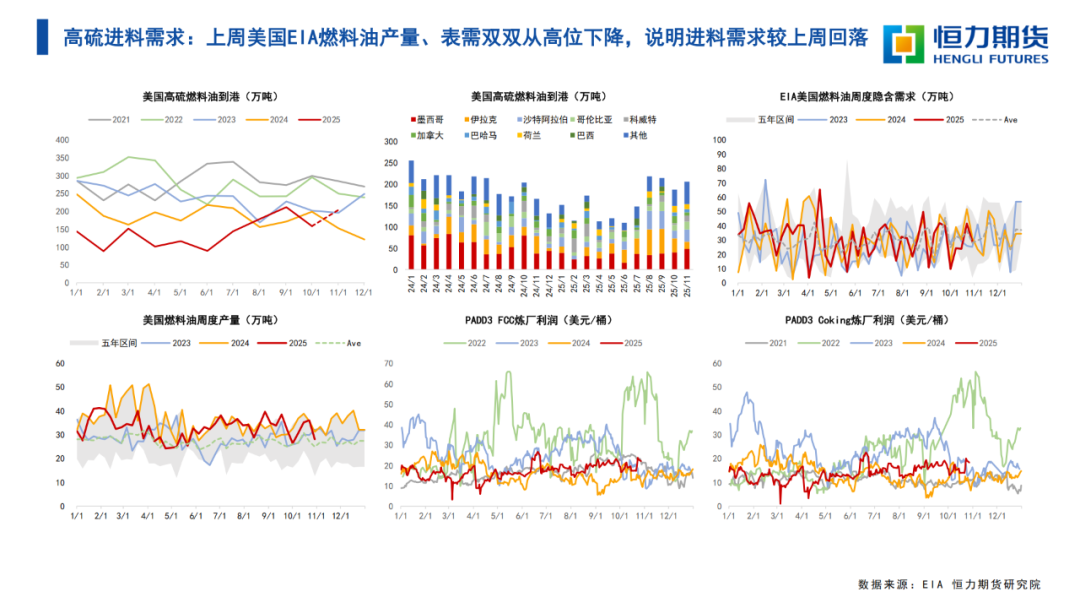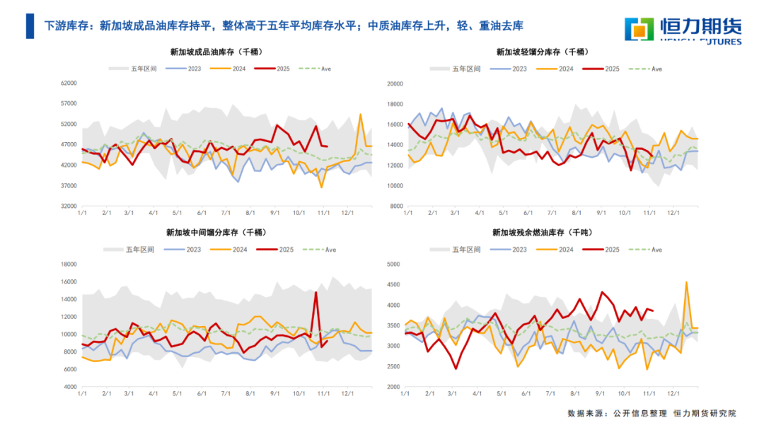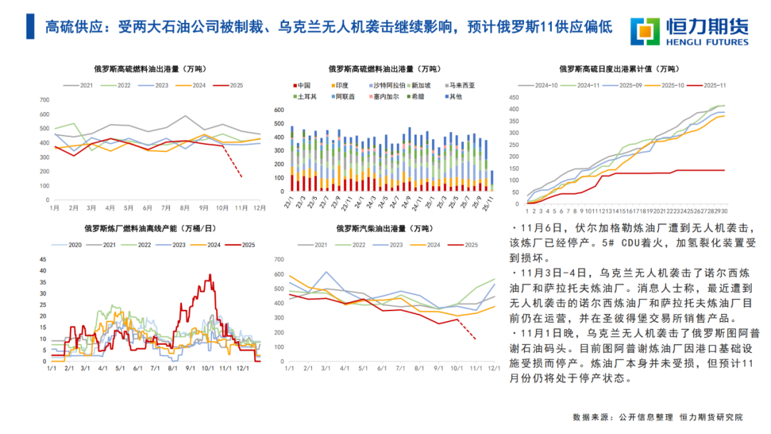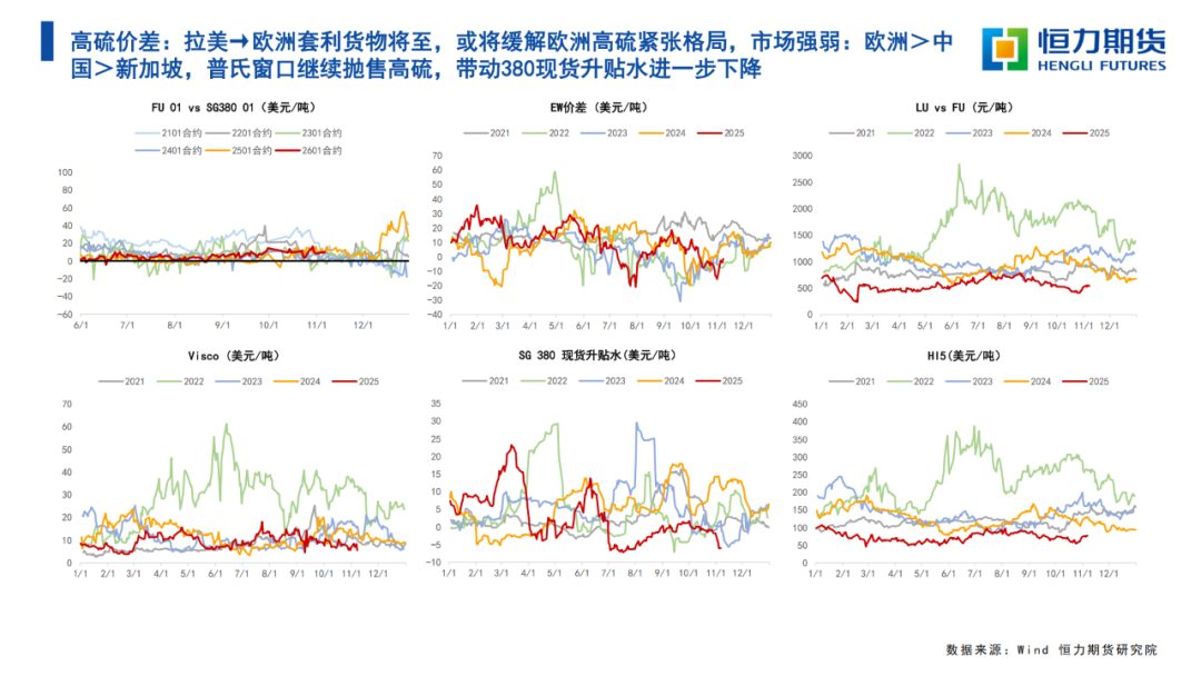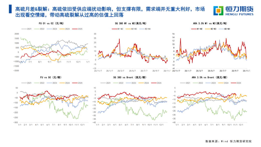 高硫:此前我们判断高硫估值已经见顶、难以向上突破,目前高硫供应端扰动支撑有限,需求端并无重大利好,市场出现看空情绪,进一步带动高硫裂解从过高的估值上回落。供应端,俄罗斯供应端扰动频出,上周伏尔加格勒炼油厂遭到无人机袭击,5# CDU着火,加氢裂化装置受到损坏,炼厂停产;图阿普谢炼油厂因港口基础设施受损而停产。但之前遇袭的炼厂大多于11月回归,炼厂检修量大幅回落,且俄罗斯供应端的减量可被中东增量部分弥补,SOMO已发布2026年上半年招标,总量超600万吨。高硫供应减量或少于预期,供应端扰动支撑有限。需求端继续关注原油配额下发情况,但暂未出现明显利好驱动。
