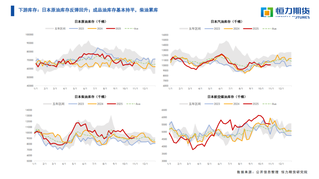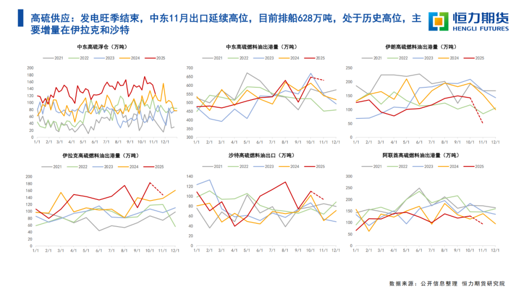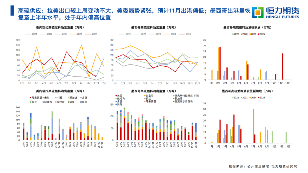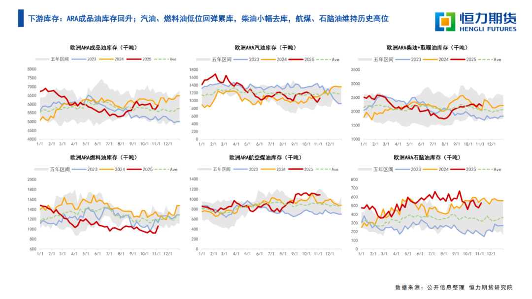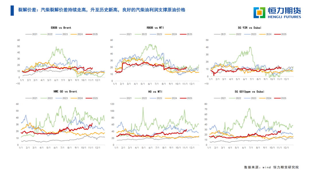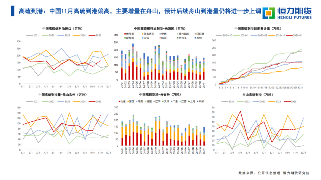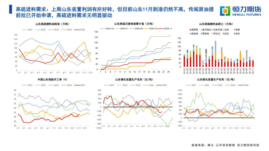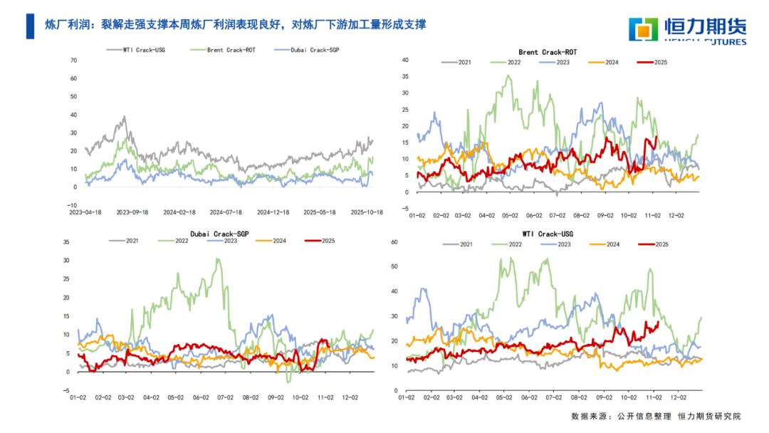 高硫:此前我们判断高硫估值已经见顶、难以向上突破,目前高硫供应端扰动支撑有限,需求端并无重大利好,市场出现看空情绪,进一步带动高硫裂解从过高的估值上回落。供应端,俄罗斯供应端扰动频出,上周伏尔加格勒炼油厂遭到无人机袭击,5# CDU着火,加氢裂化装置受到损坏,炼厂停产;图阿普谢炼油厂因港口基础设施受损而停产。但之前遇袭的炼厂大多于11月回归,炼厂检修量大幅回落,且俄罗斯供应端的减量可被中东增量部分弥补,SOMO已发布2026年上半年招标,总量超600万吨。高硫供应减量或少于预期,供应端扰动支撑有限。需求端继续关注原油配额下发情况,但暂未出现明显利好驱动。
