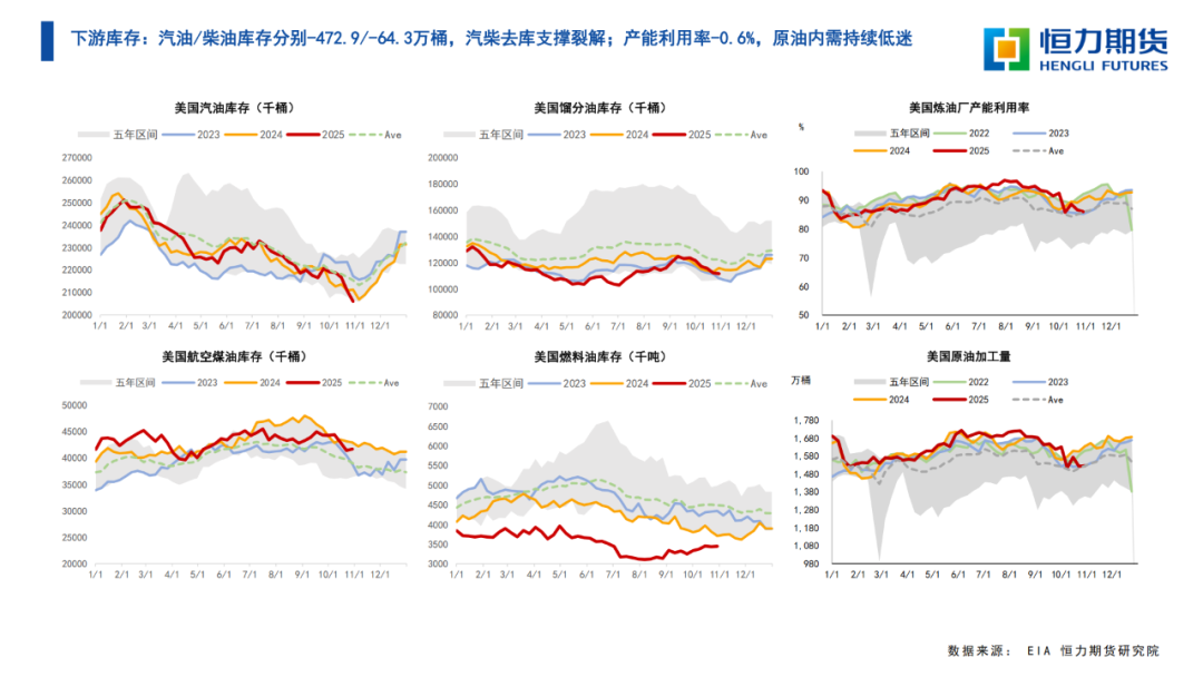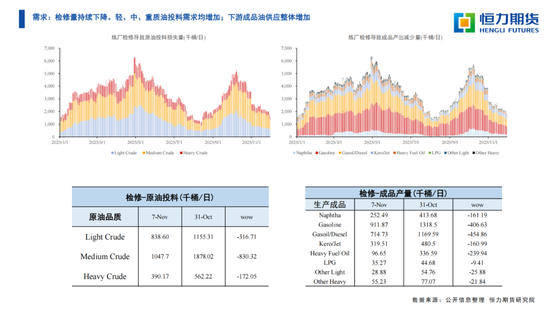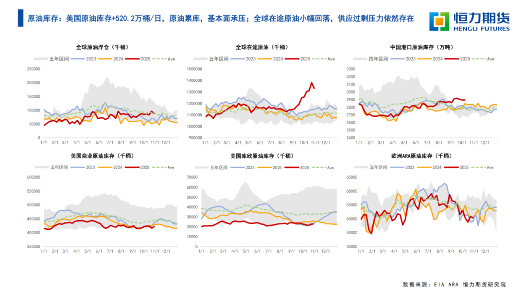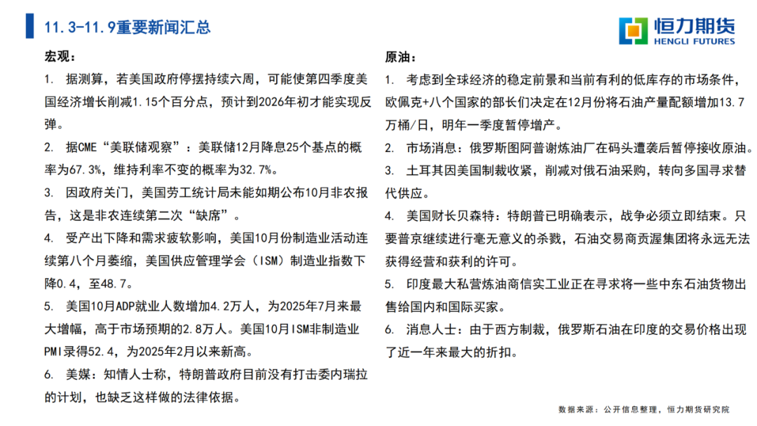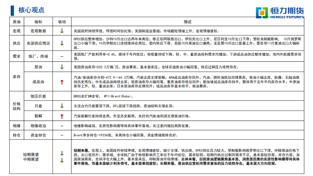 短期来看,宏观上,美国政府持续停摆,宏观情绪疲软,缺少支撑。供应端,OPEC供应压力较大,受制裁影响俄罗斯出口下滑,伴随俄油价格下跌,出口或回升;需求端,全球炼厂由于检修影响开工率位于年内低位,需求较弱;短期内供应过剩而需求不足,基本面较悲观。库存方面,美国原油累库,全球浮仓大幅上升,基本面承压,抑制原油市场情绪。总体来看,目前原油逻辑聚焦基本面,消息面因素的实质性影响需等待具体事件落地,而基本面缺少利多信号,基本面表现疲软;长期来看,原油供应宽松而需求紧张的压力依然存在,基本面大方向悲观。