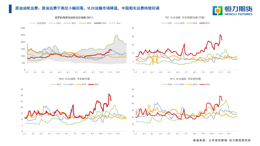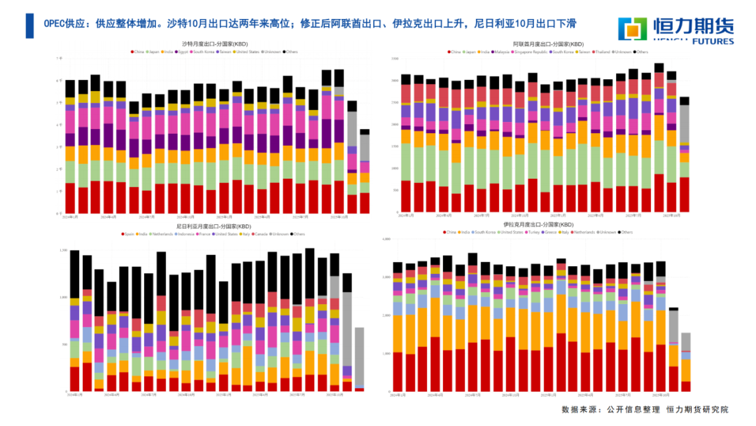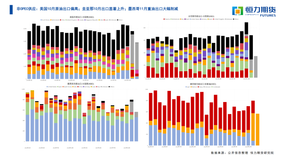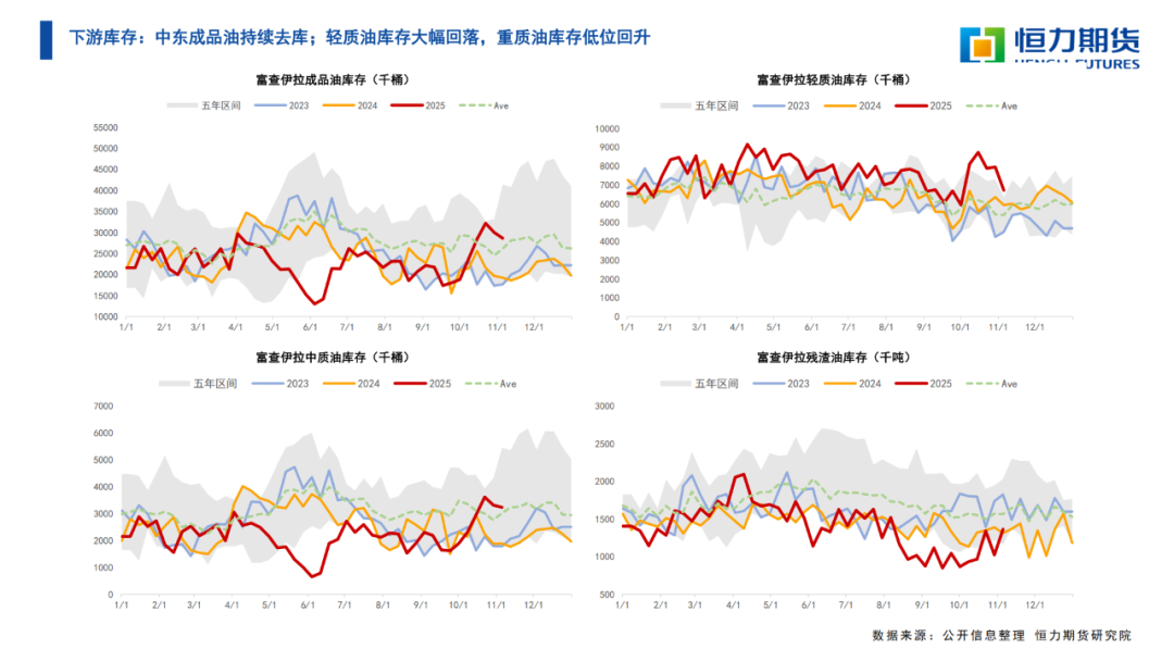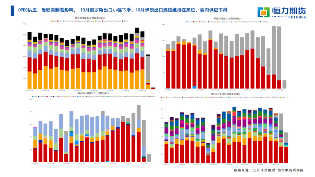 短期来看,宏观上,美国政府持续停摆,宏观情绪疲软,缺少支撑。供应端,OPEC供应压力较大,受制裁影响俄罗斯出口下滑,伴随俄油价格下跌,出口或回升;需求端,全球炼厂由于检修影响开工率位于年内低位,需求较弱;短期内供应过剩而需求不足,基本面较悲观。库存方面,美国原油累库,全球浮仓大幅上升,基本面承压,抑制原油市场情绪。总体来看,目前原油逻辑聚焦基本面,消息面因素的实质性影响需等待具体事件落地,而基本面缺少利多信号,基本面表现疲软;长期来看,原油供应宽松而需求紧张的压力依然存在,基本面大方向悲观。