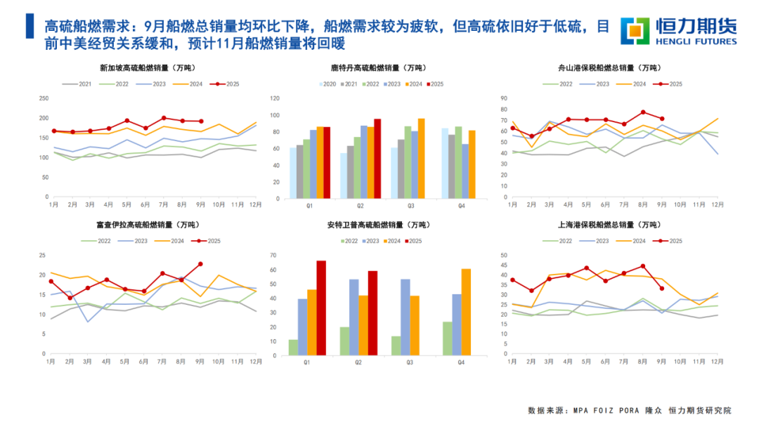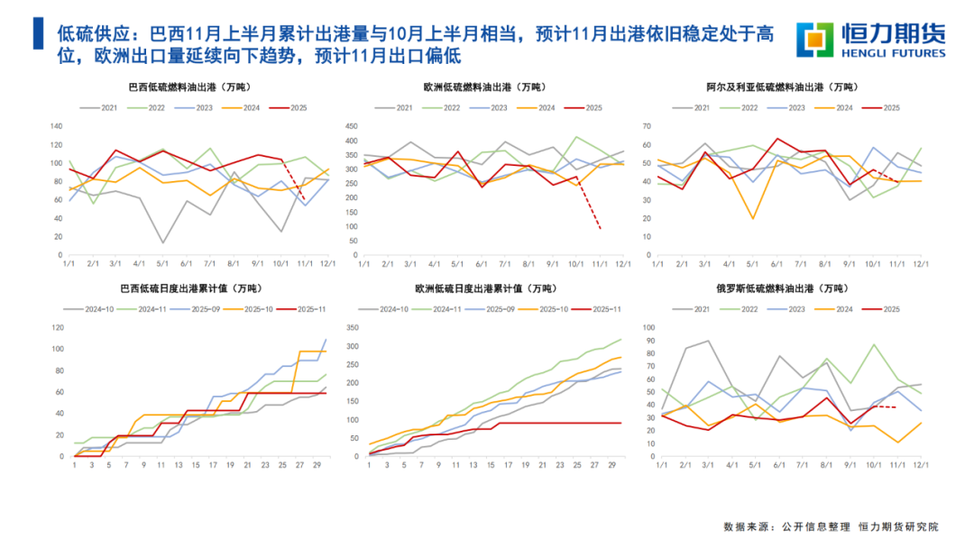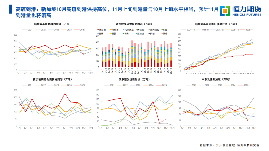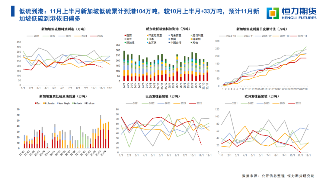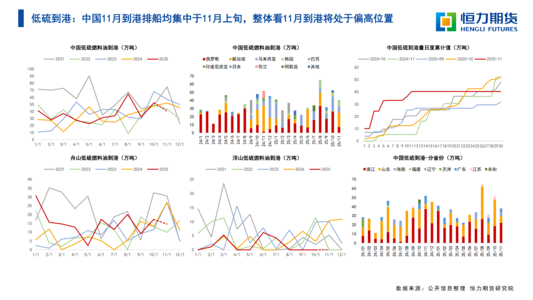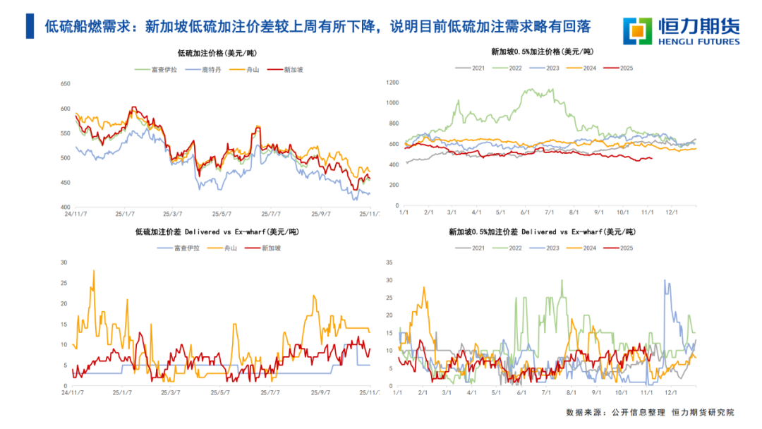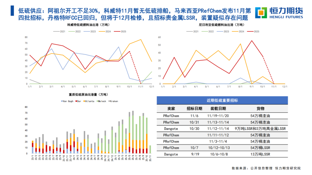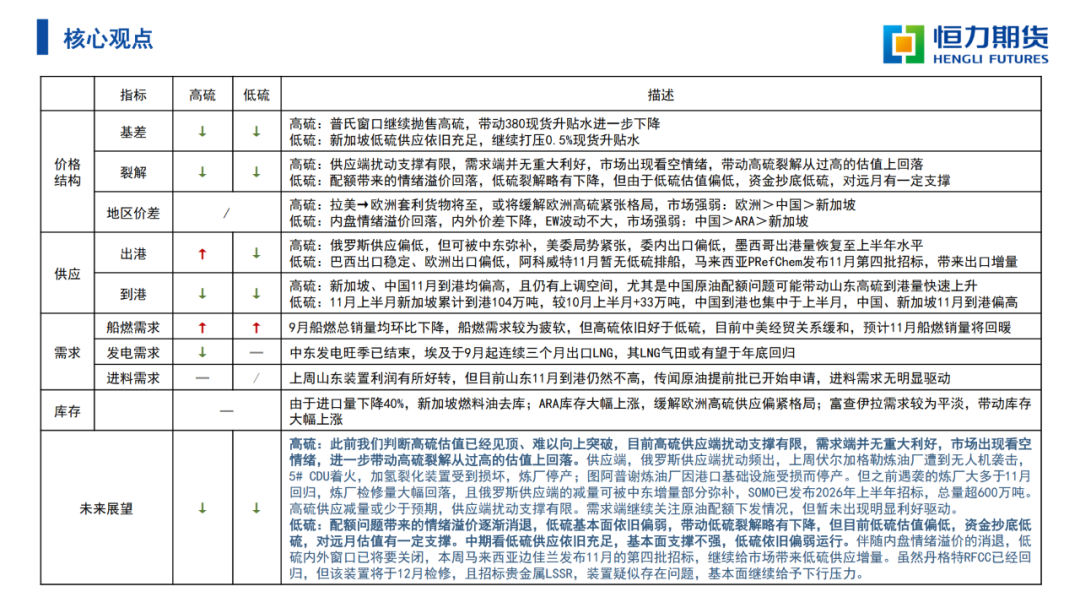 低硫:配额问题带来的情绪溢价逐渐消退,低硫基本面依旧偏弱,带动低硫裂解略有下降,但目前低硫估值偏低,资金抄底低硫,对远月估值有一定支撑。中期看低硫供应依旧充足,基本面支撑不强,低硫依旧偏弱运行。伴随内盘情绪溢价的消退,低硫内外窗口已将要关闭,本周马来西亚边佳兰发布11月的第四批招标,继续给市场带来低硫供应增量。虽然丹格特RFCC已经回归,但该装置将于12月检修,且招标贵金属LSSR,装置疑似存在问题,基本面继续给予下行压力。