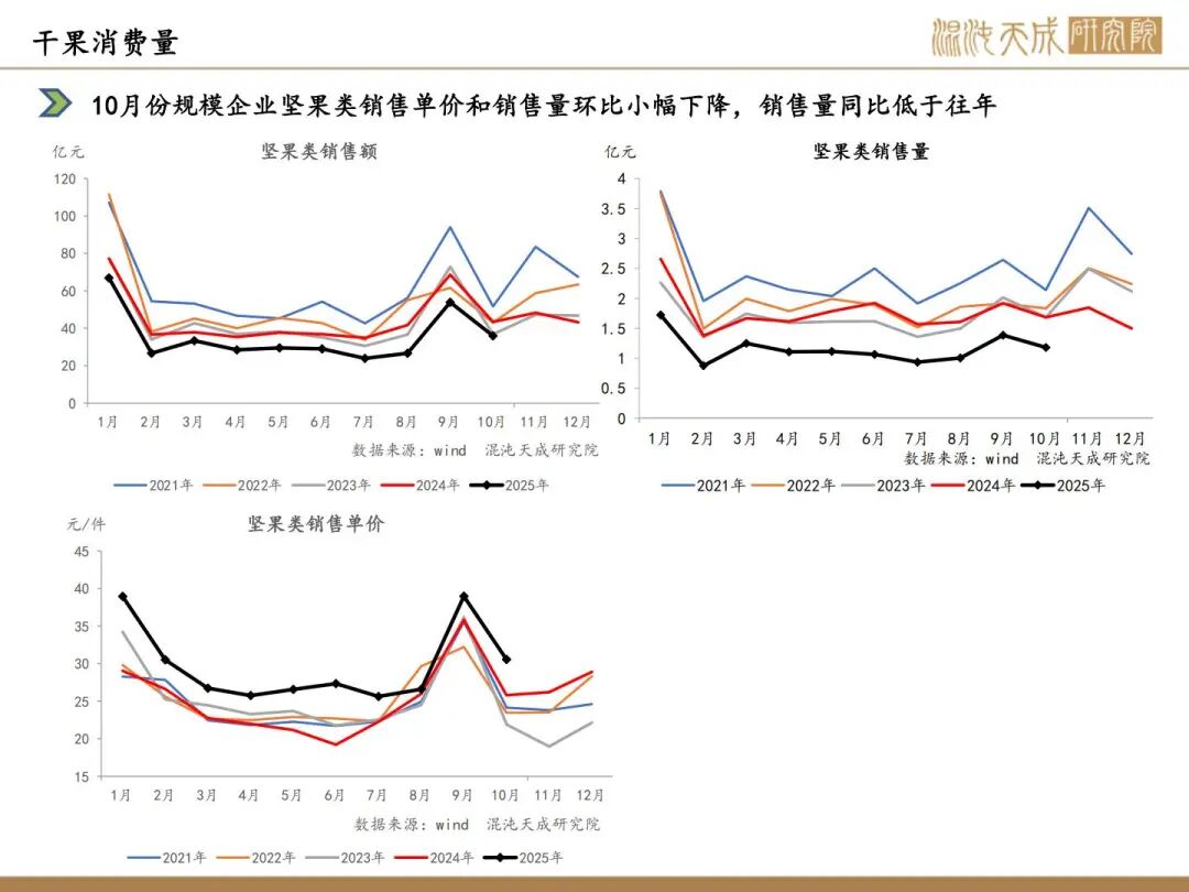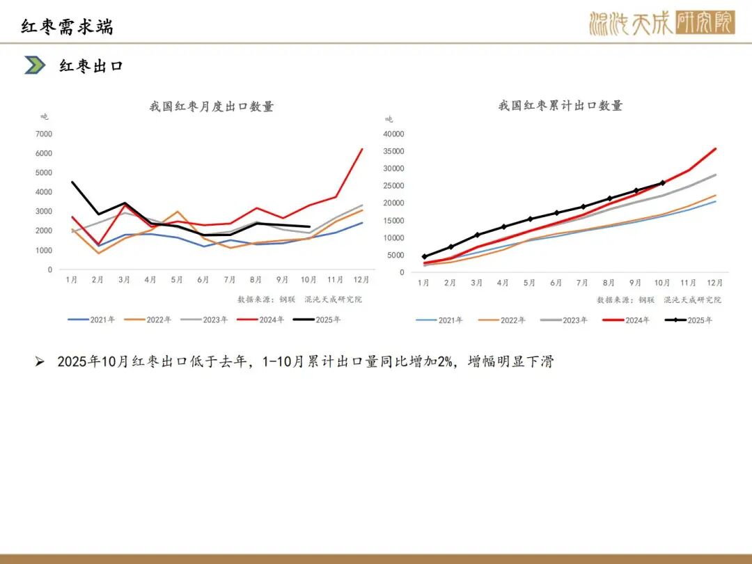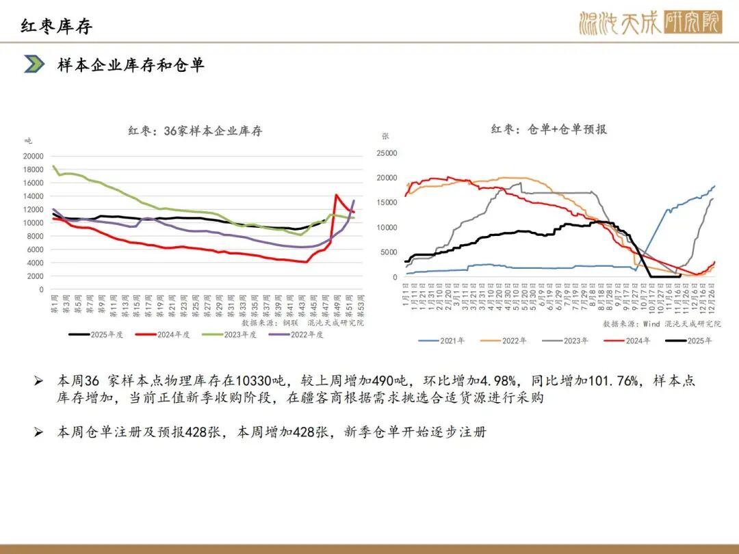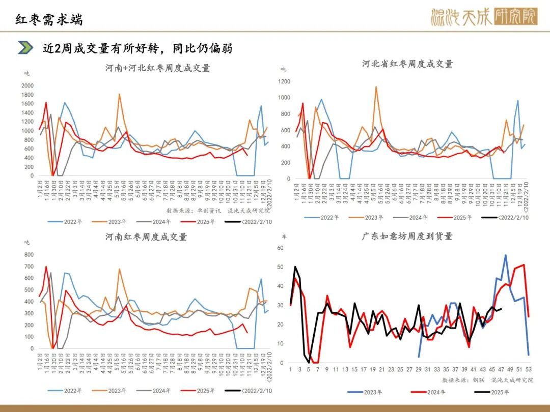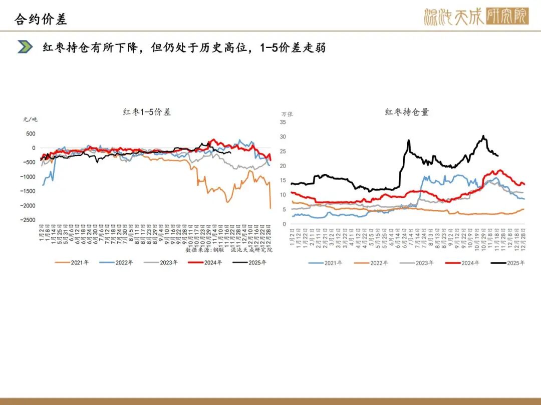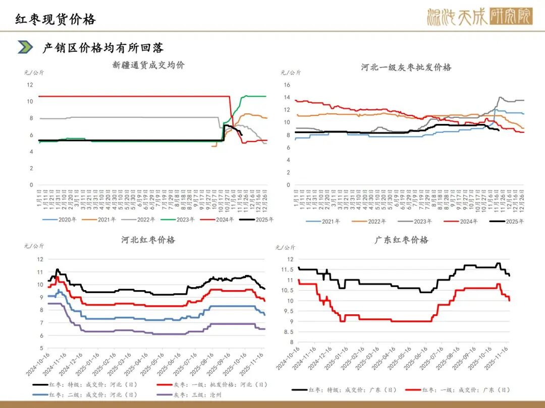 本周红枣盘面继续走弱,2601合约下破9000元/吨。新疆产区灰枣收购进度在4-5成左右,阿克苏地区通货主流价格5.00-6.00元/公斤,收购进度在8成左右,阿拉尔地区通货主流价格5.00-6.30元/公斤,收购进度在6-7成左右,阿克苏及阿拉尔地区收购进度较快,已签订货源陆续装箱发运,喀什兵团及地方收购价格参考6.50-7.30元/公斤,目前成交少量,主产区成交区间价格较上周下调0.3-0.5元/公斤,在疆客商高价采购积极性较低;河北市场停车区到货量40余车,本周特级均价9.75元/公斤,较上周10.02元/公斤下跌0.27元/公斤。