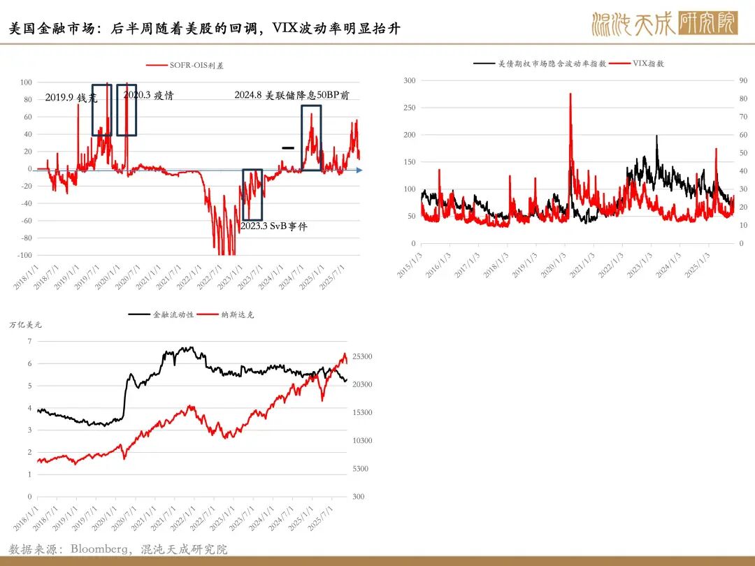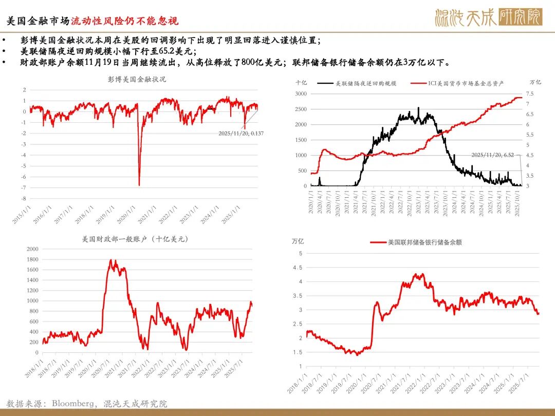 金融流动性风险仍不可忽视:美联储通过QT缩表收回银行准备金仍在继续,联邦储备银行储备余额仍在持续下行,现阶段为2.855万亿美元;而隔夜逆回购的缓冲垫流动性已经基本耗尽(60亿美元);TGA账户囤积资金,政府重启后尚未大幅释放流动性,11月开始大约释放了800亿美元;本周主要的流动性计价来自于美股的走势,本周科技股出现大幅回调,市场走势明显偏弱,这一定程度上影响了以美股为核心的美元流动性;总体而言,接下来流动性的观察仍以TGA账户资金释放和美股走势作为关键因素,底层资产不出现明显风险的情况下,短线流动性风险会自动缓解。