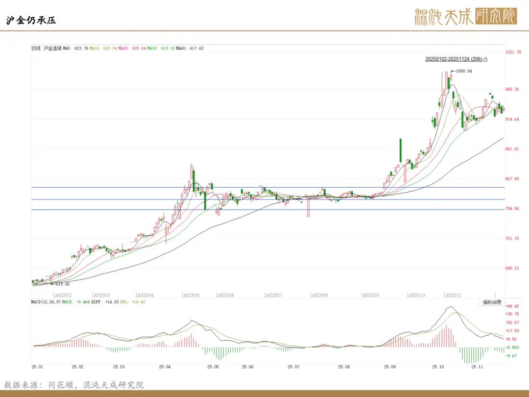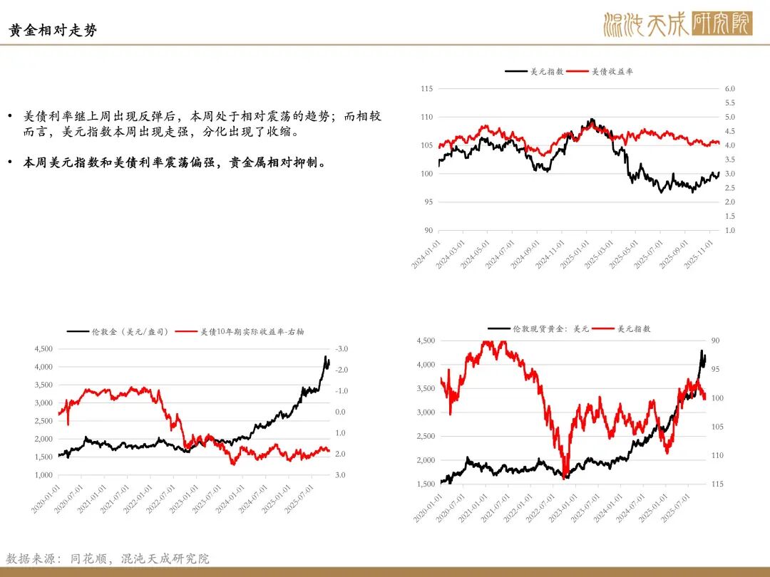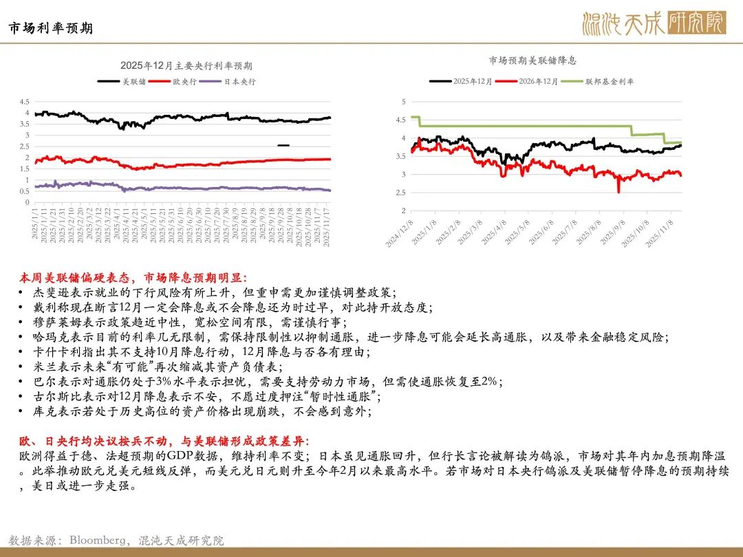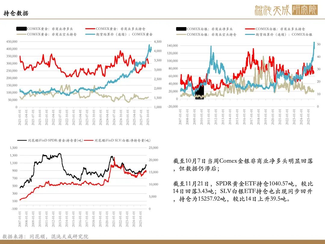 美联储官员密集鹰派发言:巴尔表示对通胀仍处于3%水平表示担忧,需要支持劳动力市场,但需使通胀恢复至2%;哈玛克表示进一步降息可能会延长高通胀,以及带来金融稳定风险;古尔斯比表示对12月降息表示不安,不愿过度押注“暂时性通胀”;库克表示若处于历史高位的资产价格出现崩跌,不会感到意外;美联储10月的会议纪要显示出严重分歧,本月在缺乏数据指引的情况下仍维持分歧。美国劳工统计局表示,将不会发布10月非农就业报告,而是把相关的就业数据纳入11月报告并将于12月16日发布,这一日期是在美联储今年最后一次会议之后。随着数据缺乏指引,美联储分歧加大,市场的降息预期持续回落,基本不定价12月的降息(27%),这也严重抑制贵金属的走势。