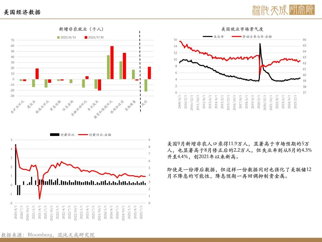 美国政府停摆结束,市场开始计价后续数据公布以及此次关门带来的实际经济风险。美国9月新增非农人口录得11.9万人,显著高于市场预期的5万人,也显著高于8月修正后的2.2万人,从分项数据来看,主要的劳动力增长集中在教育医疗和政府行业,建筑行业有所正增长,但制造业就仍低迷。失业率则从8月的4.3%升至4.4%,创2021年以来新高。即使是一份滞后数据,但这样一份数据同时也强化了美联储12月不降息的可能性,降息预期一再回调抑制贵金属。